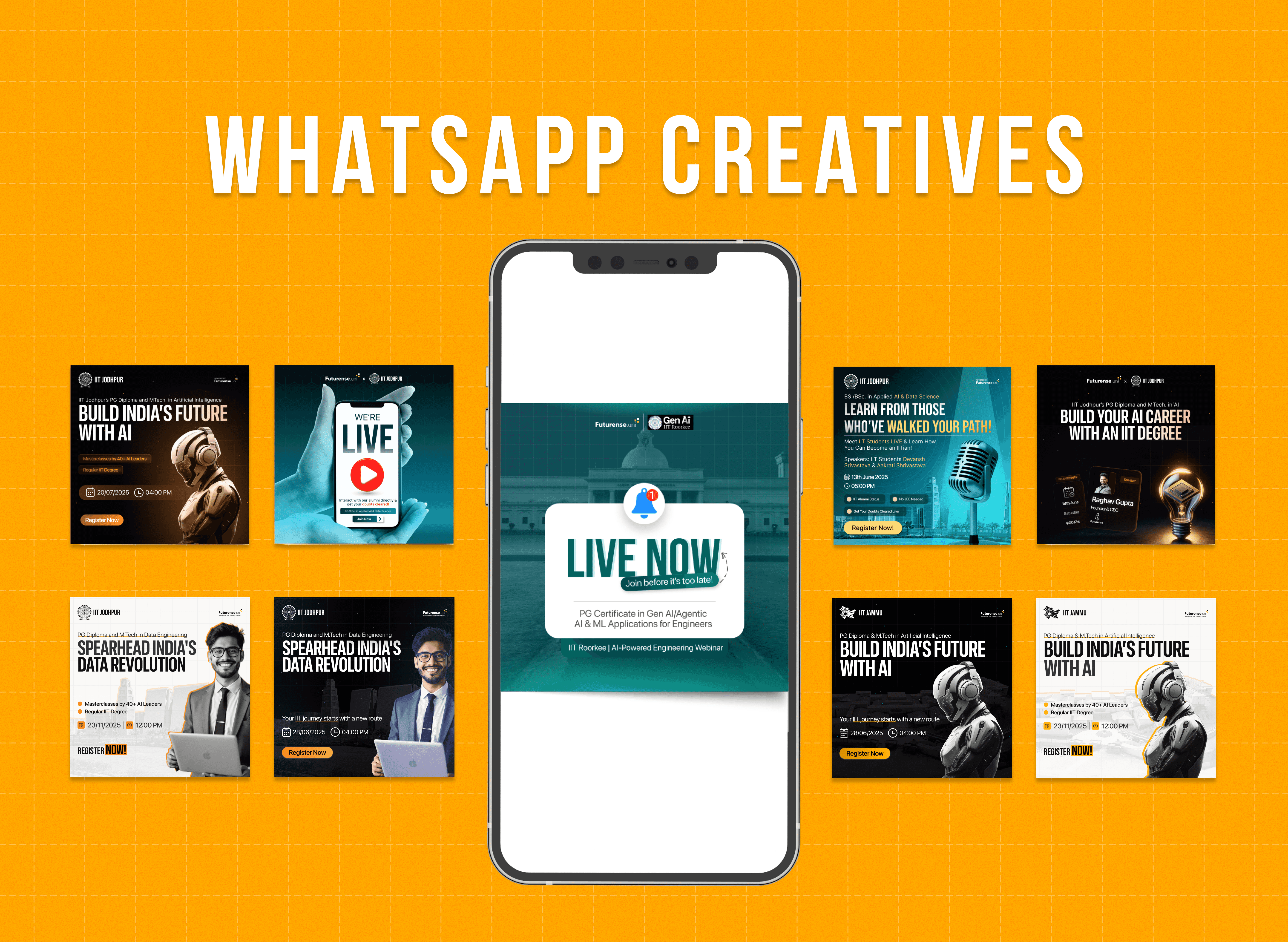 A collection of high-impact visual design work created at Futurense Technologies, spanning social media, performance marketing, pitch decks, and brand collaterals focused on building scalable, conversion-driven design systems in the edtech space.