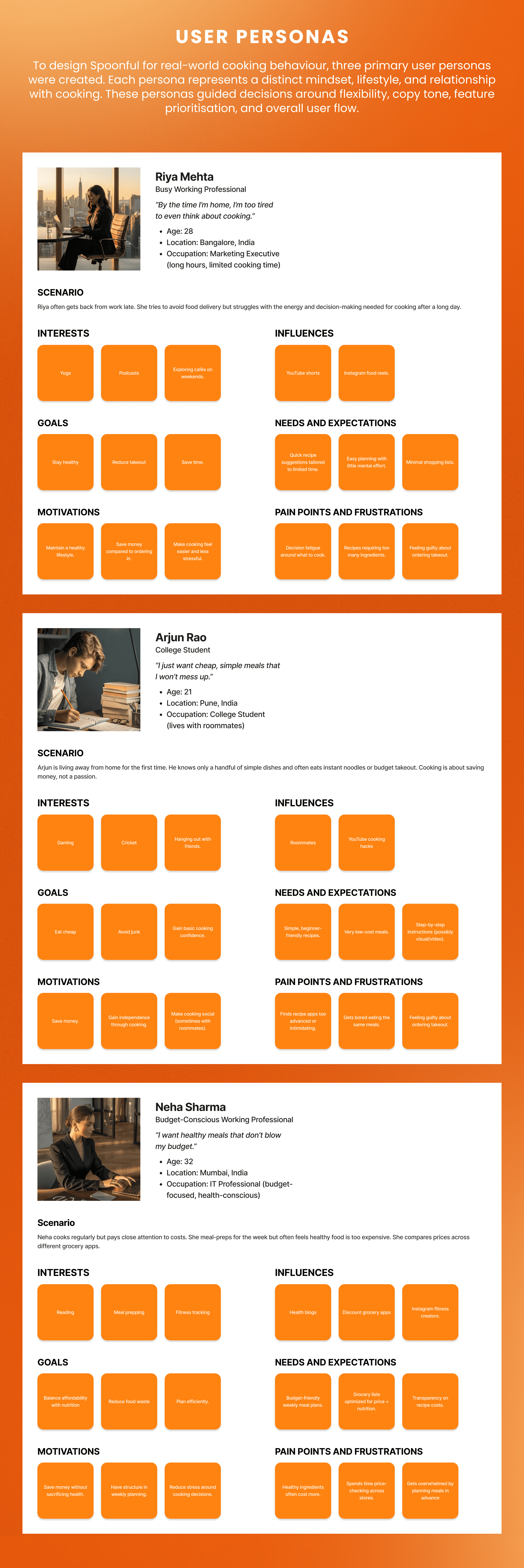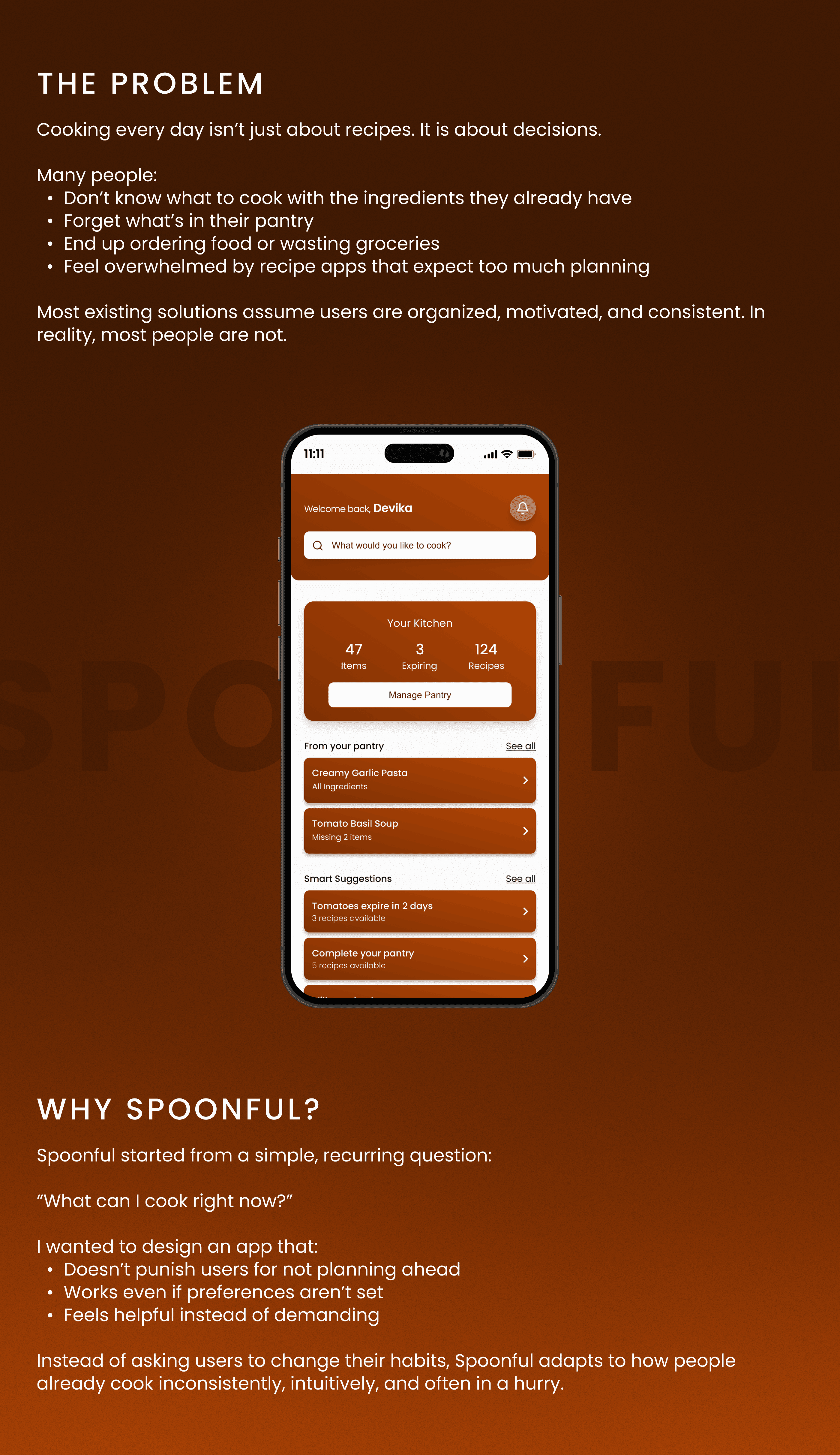 Spoonful is a food management app designed to reduce everyday cooking decision fatigue by helping users figure out what to cook using ingredients they already have. Instead of forcing structured meal planning, the app adapts to real, imperfect routines—offering flexible, low-effort support that feels intuitive, helpful, and non-demanding.