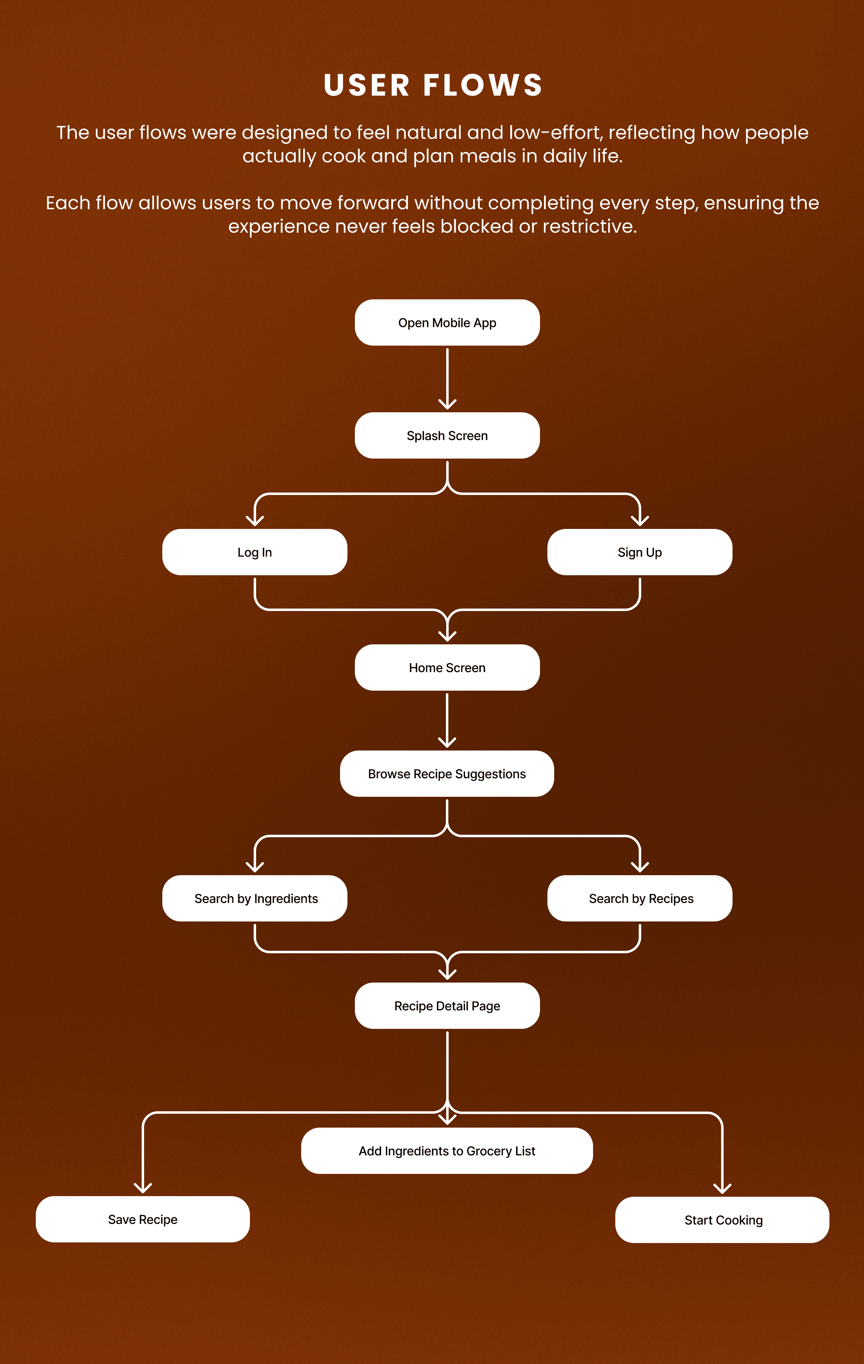 Cooking isn’t just about recipes—it’s about constant decision-making. Many users struggle to figure out what to cook, forget what ingredients they have, or feel overwhelmed by apps that require structured planning. Existing solutions assume consistency and motivation, while in reality, users operate in low-energy, unplanned states.