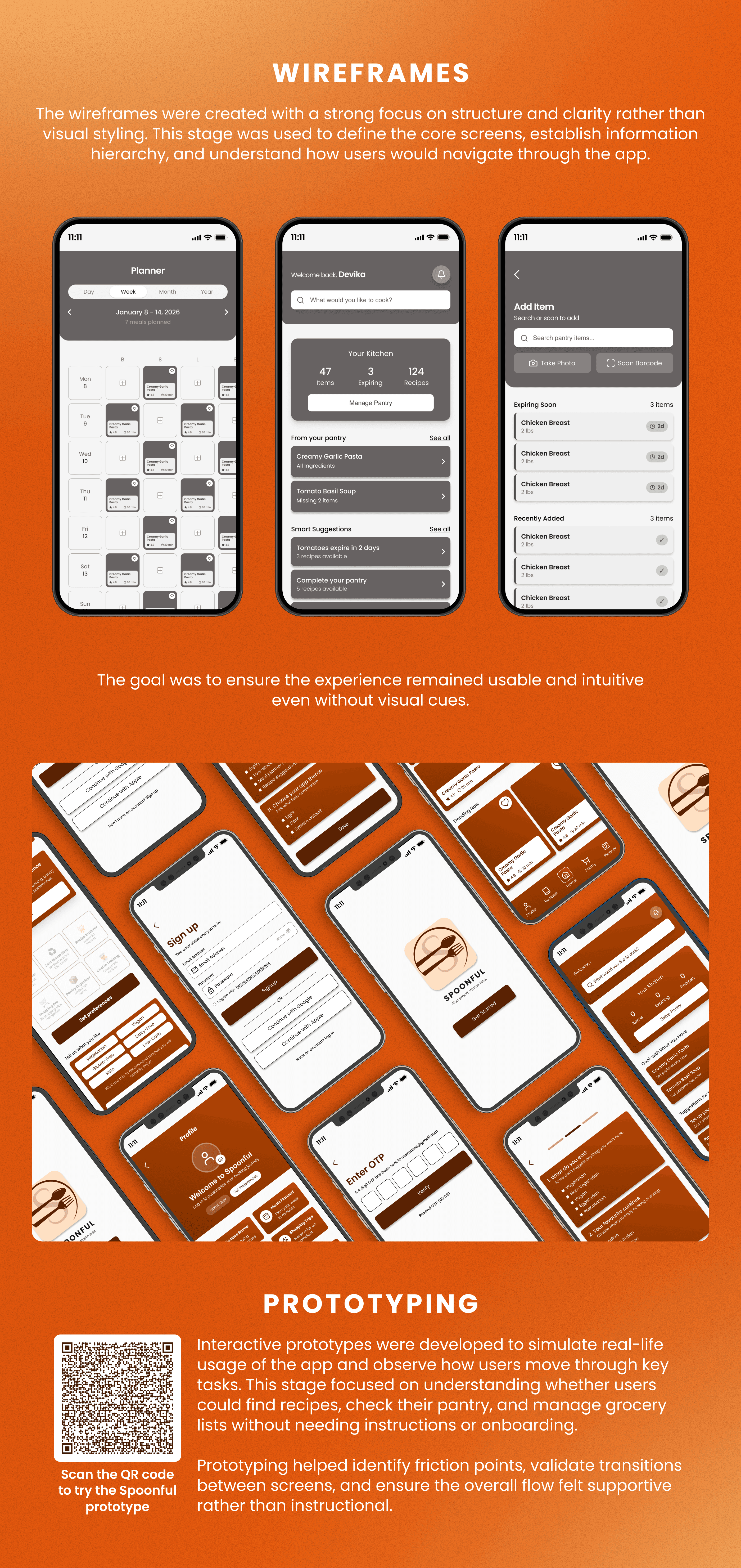 The solution focuses on reducing friction at every step. Spoonful suggests recipes based on available ingredients, allows flexible pantry awareness without strict tracking, and uses clear, conversational microcopy to guide users. The experience is designed to feel like a gentle assistant rather than a rigid planner.